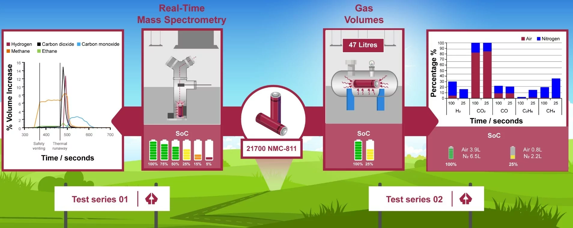 The failure of lithium-ion batteries can be partly defined by the release of toxic and flammable gases. The composition and volume of these gases varies depending on cell type, failure mechanism, state of charge (SoC) and environmental oxygen levels. Understanding this relationship and the species produced is essential for battery pack manufacturers relying on real-time monitoring to assess the state-of-health of a LIB. It also has ramifications for emergency responders attending thermal runaway events.