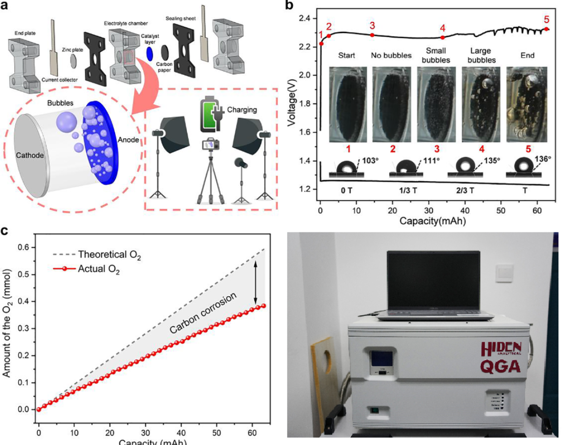 Although tremendous efforts are made in developing stable Zn electrodes and bifunctional catalysts in rechargeable Zn–air batteries, the charging process is seldom reported. Herein, in-depth investigation and quantification of the gas evolution on the air electrode is conducted by in-situ characterization using the Hiden QGA.